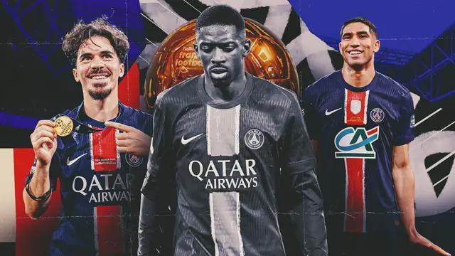 巴黎圣日耳曼(433):舍瓦利耶/阿什拉夫、马尔基尼奥斯、帕乔、努诺-门德斯/若昂-内维斯、维蒂尼亚、法比安-鲁伊斯/杜埃、登贝莱、巴尔科拉